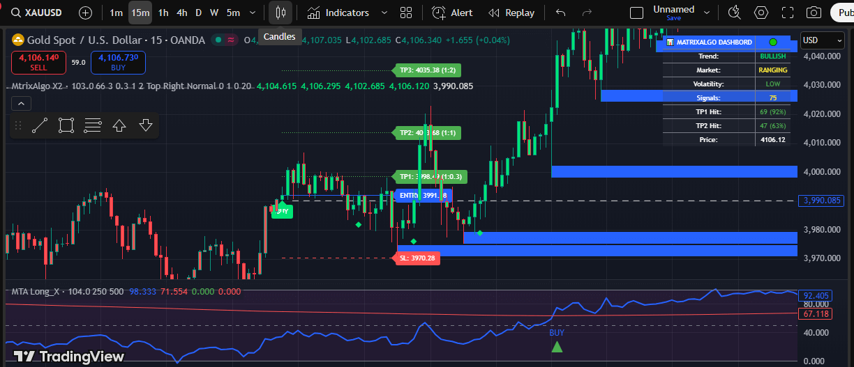MatrixAlgo X is a comprehensive trading indicator that combines SuperTrend-based signal generation with multi-timeframe trend analysis, ranging market detection, and optional Blackflag FTS (Fibonacci Trailing Stop) integration. It's designed to provide traders with high-quality entry signals while filtering out false signals during ranging market conditions.